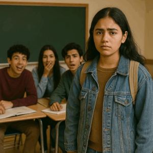 Elena’s fingers tightened around the strap of her backpack. Her cheeks flushed, but she didn’t respond. She sat down slowly, lowering her gaze to the cracked wooden surface of her desk.