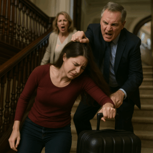 Her defiance lit the fuse. William surged forward, grabbing her by the hair. Pain seared her scalp as he dragged her down the marble staircase, her body thudding against each step. Rebecca shouted, “Leave her with nothing!”