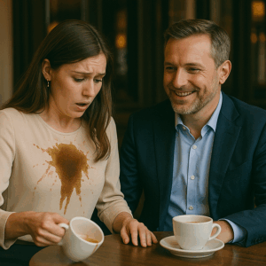 When the waiter came, Emma tried to act composed. She reached for her cup… but her hands were trembling just enough for disaster.