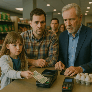 Daniel Hayes, a 34-year-old single father, was pushing a squeaky shopping cart through the crowded aisles of GreenMart, clutching a crumpled list and doing mental math with every item he picked up. Since his wife passed away two years earlier, every dollar counted. His 7-year-old daughter, Lily, walked beside him, humming softly, holding her favorite stuffed rabbit that had seen better days.