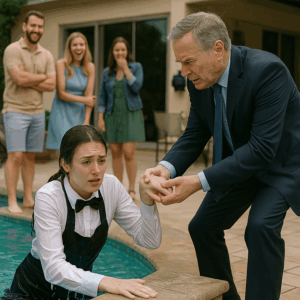 When a Waitress Was Pushed Into a Pool During a Lavish Party and Everyone Laughed, She Tried to Hide Her Tears — But When a Quiet Billionaire Guest Stood Up, Walked Toward the Water, and Said Just Seven Words, the Entire Crowd Went Silent Forever.