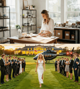 “What the—” she muttered, shielding her eyes as the wind from the rotors whipped her dress against her legs. Cups tipped. Hair went wild. The welcome table’s name tags scattered like oversized confetti.