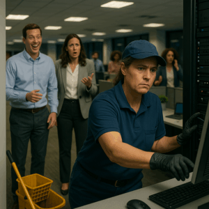 When the Whole Office Laughed at the Quiet Night Janitor for Volunteering to Fix the Crashed System, They Went Dead Silent and Terrified When She Sat Down, Started Typing, and Actually Brought It Back to Life