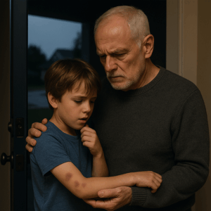 I felt my pulse thunder in my ears. And then I saw them—the faint purple rings around his wrist, the unmistakable imprint of an adult’s hand.