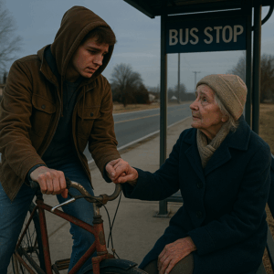 Everyone ignored the frail old woman at the bus stop — except for one exhausted, hungry teenager with nothing to his name but an old bicycle and a heart that refused to look away.