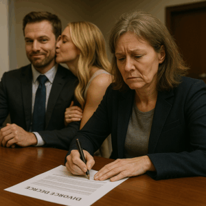 The insult sliced deeper than any legal clause. Khloe smirked, her diamond ring catching the light like a trophy. Amelia signed her name with steady hands, each stroke closing a chapter she had once believed indestructible.
