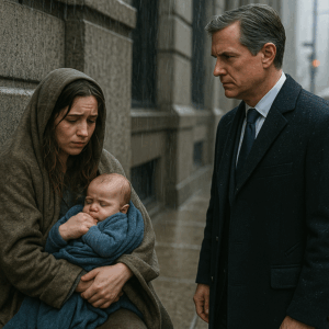 He stepped out, rain soaking through his tailored suit in seconds. The streetlights painted his figure in silver and shadow. The woman flinched when he approached, pulling the baby closer.