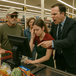 The cashier froze. She lowered her head, her lips pressed together as if to hold back tears. Customers in line exchanged uneasy glances, but nobody moved.