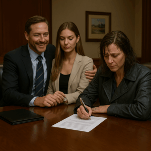 Three attorneys sat waiting. One of them, gray-haired and severe, slid a folder toward her.