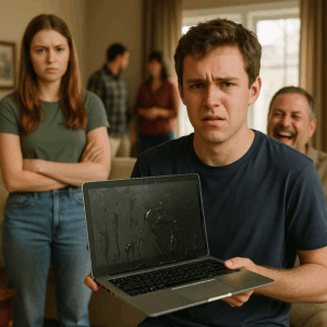 He took one look at me kneeling beside the ruined laptop and burst out laughing.