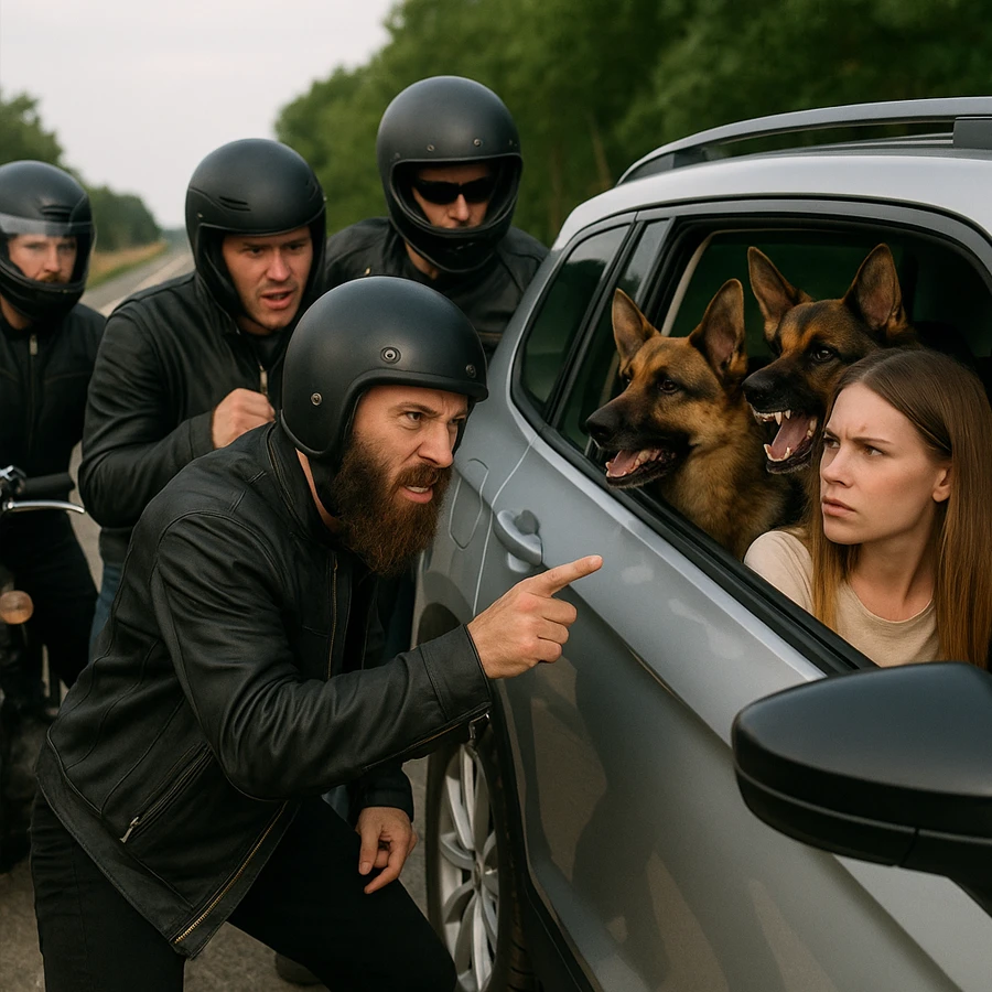 When one of the bikers tried to yank the door handle at a red light, the dogs erupted. Their growls were deep, sharp, and terrifying—sounds no ordinary pet could make. The biker jumped back, startled, and shouted to his friends, “She’s got killers in there!”