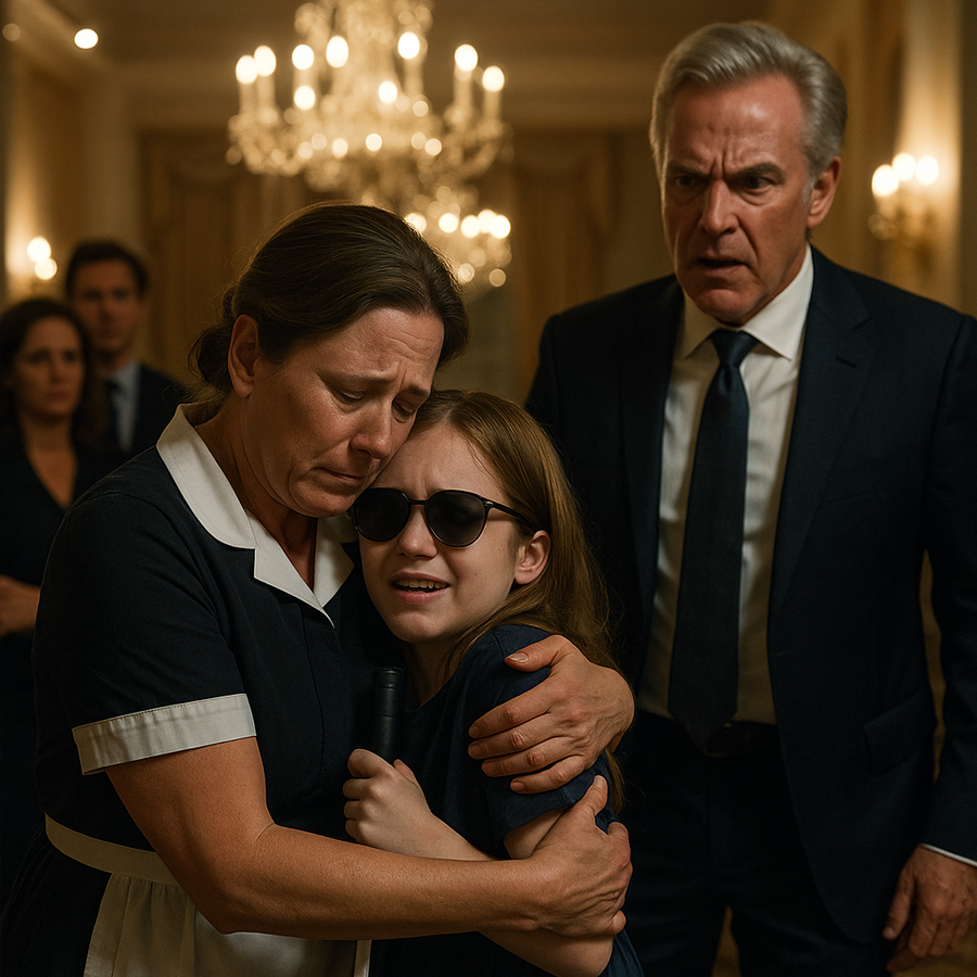 It happened one evening after a grand dinner. Guests had left, the mansion was quiet, and the girl sat alone in the living room, clutching her white cane. The maid, finishing her chores, saw her trembling. She dropped everything, sat beside her, and embraced her tightly.