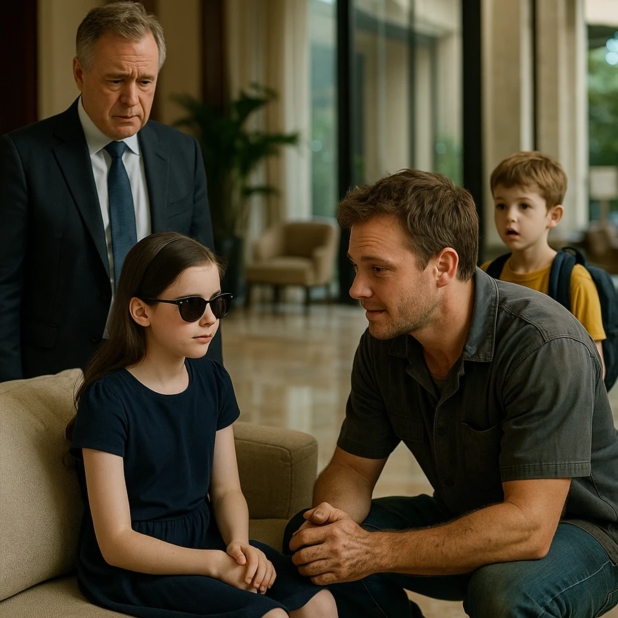The children met by accident in the lobby. Noah, with his backpack too big for his shoulders, noticed Emily sitting alone on the leather sofa, her hands folded tightly as though holding her breath. He asked her name. No reply. He asked again. Still nothing. Then Ethan, wiping his greasy hands on a rag, crouched beside her.