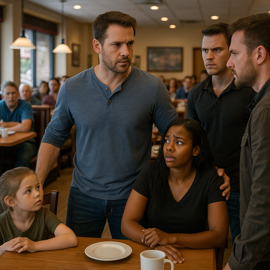 The aggressors laughed mockingly, but the father didn’t flinch. He stood his ground, protecting the woman behind him. The little girl, still seated at their table, looked on with a mix of fear and awe. Other diners whispered, some fumbling for their phones, but nobody intervened.