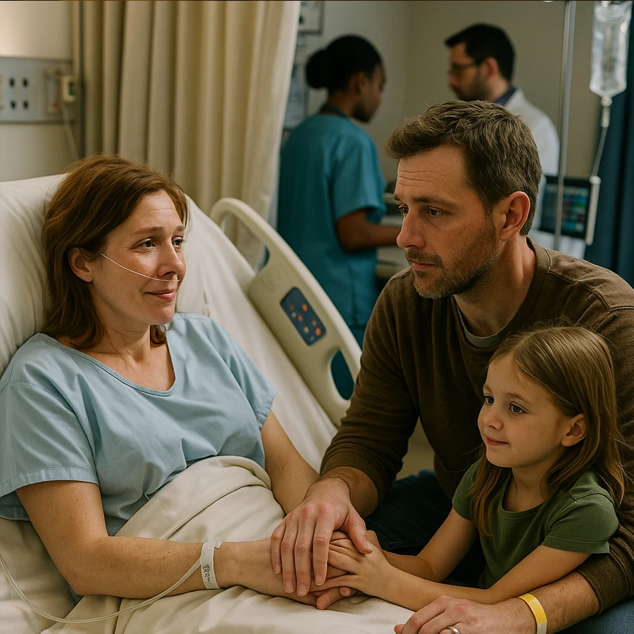 When Katherine finally woke up, her eyes fluttered open to find Daniel sitting nearby, still pale from the donation. She blinked in confusion.