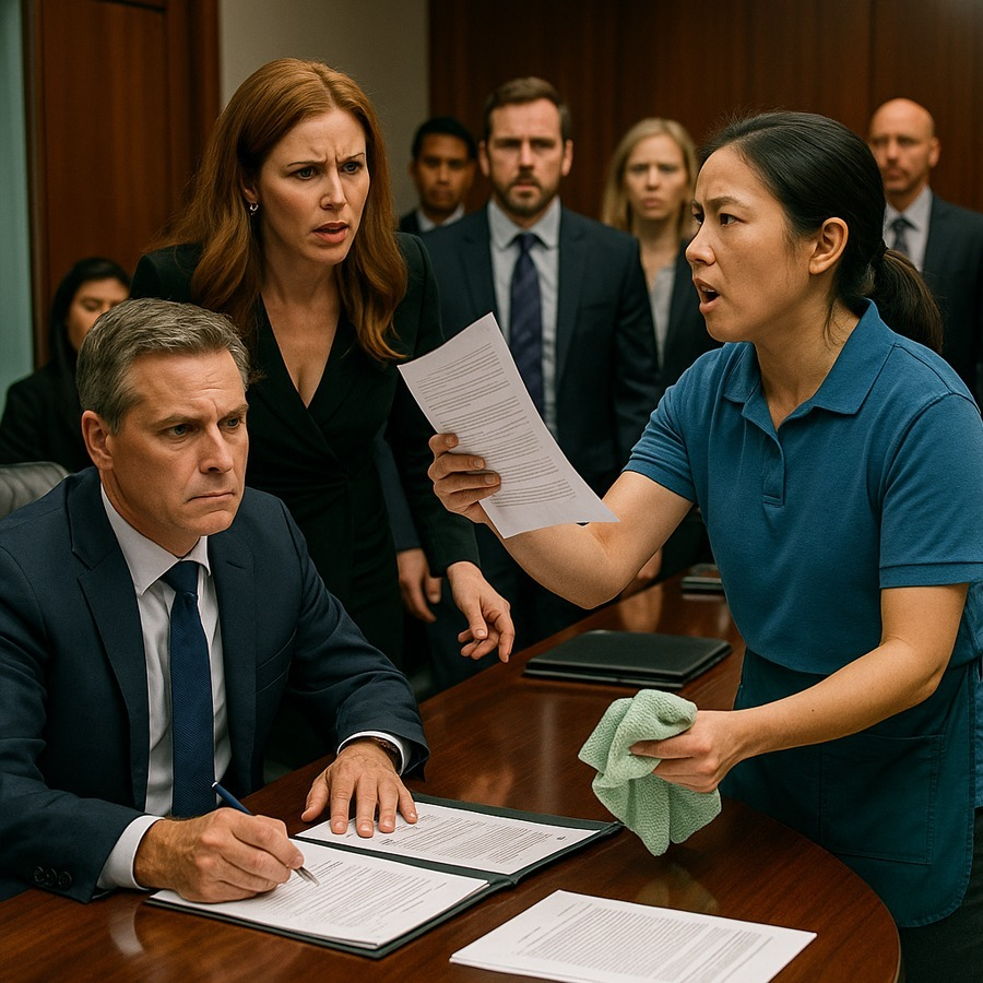 Around them, lawyers and witnesses murmured approval, ready to applaud the deal. But in the background, polishing the marble floors, stood Elena, the cleaner — invisible to most, but listening intently.