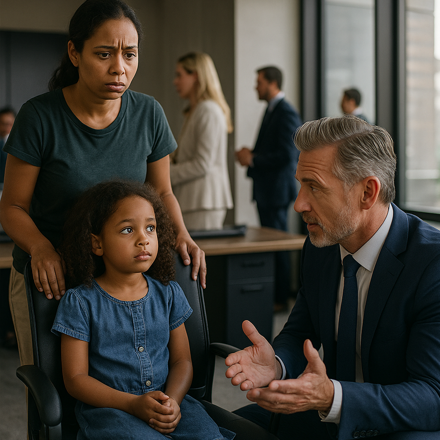 As Elena quietly guided her daughter into the office, Sofia’s wide eyes sparkled at the tall glass walls and golden elevators. The girl’s innocent curiosity stood in stark contrast to her mother’s anxious glances.