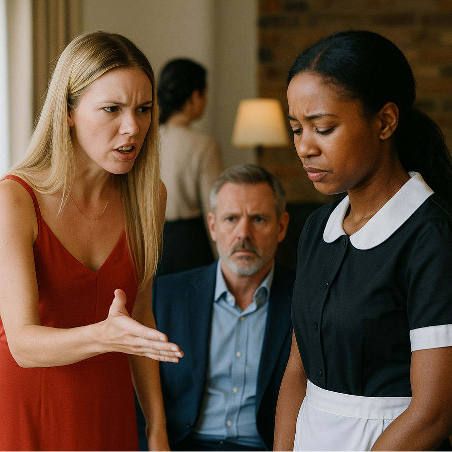 The maid, in her simple black-and-white uniform, stood silently with tears welling in her eyes, enduring a storm of humiliation while other staff members looked on helplessly.