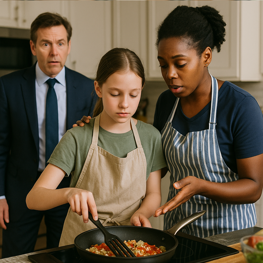 The maid, in her modest apron, leaned over the stove, guiding the delicate hands of the millionaire’s daughter. The girl, usually reserved and shy, was stirring confidently for the first time. And standing in the doorway, the millionaire himself watched, his face frozen with disbelief.
