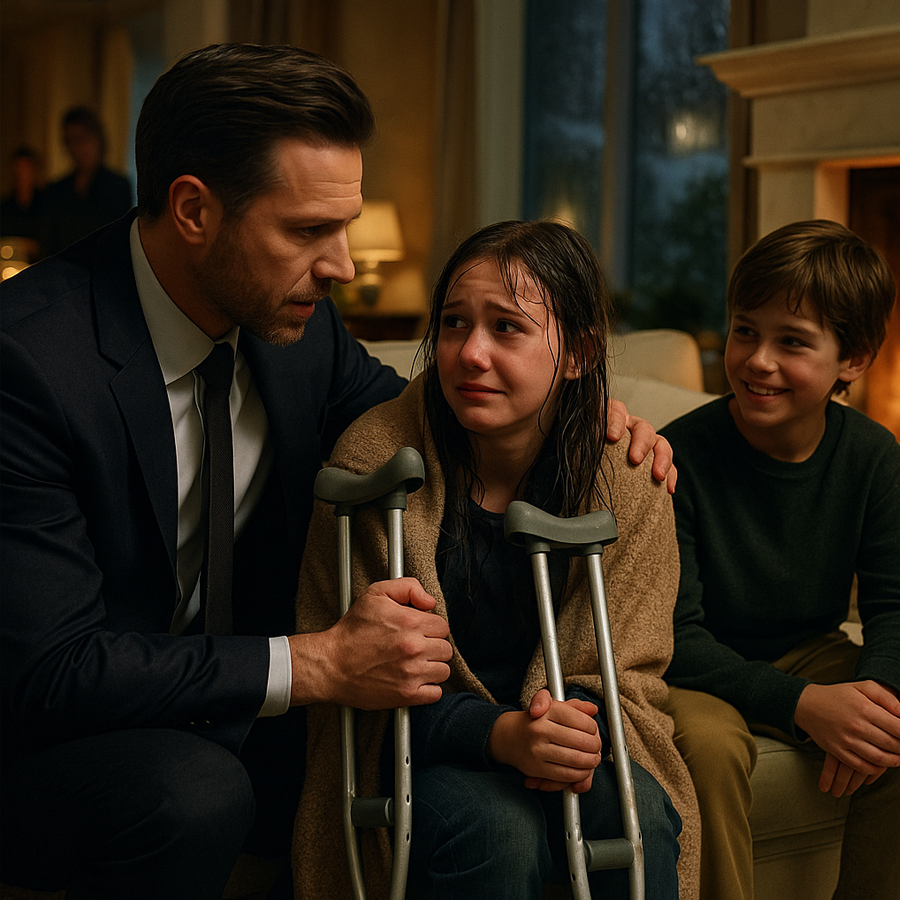 The storm rolled over the city like a monster, its claws of rain slashing against the pavement, its roar of thunder shaking windows. Most people stayed safe inside warm homes, tucked under blankets, sipping hot drinks. But out on the corner of an empty street sat a girl no older than twelve, her small frame soaked to the bone, her crutches leaning uselessly against the curb.