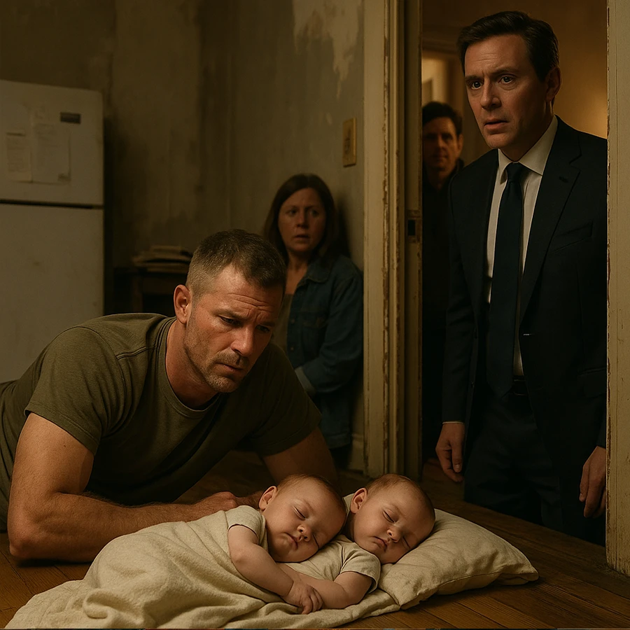 It was a scene no one expected. A decorated veteran, a man who once carried the weight of war on his shoulders, was now lying on a cold hardwood floor, his body curled around two sleeping babies. No crib. No bed. No warmth beyond the thin blanket stretched across them. The room was quiet except for the soft hum of the radiator, and the soft sound of two tiny chests rising and falling. When the door opened, everything changed.