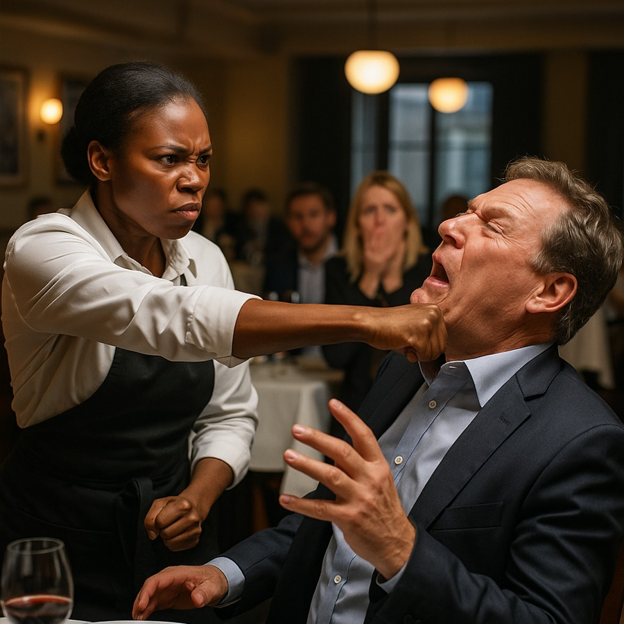The implication was cruel, aimed not only at her humble position but at her skin color. Gasps rose from the diners. Some looked away in discomfort; others chuckled nervously. Aisha froze for a moment, the tray still in her hands, the weight of years of insults pressing down on her shoulders.