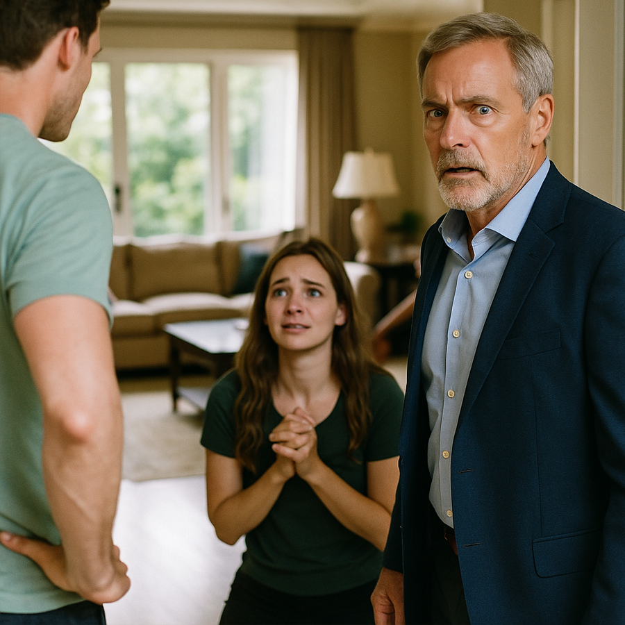 When the millionaire pushed open the door to his lavish living room, the sight before him stopped him cold. His glamorous girlfriend, dressed in an evening gown, stood frozen, her face pale. In front of her, another man—casually dressed, clearly not part of the household staff—looked just as startled.