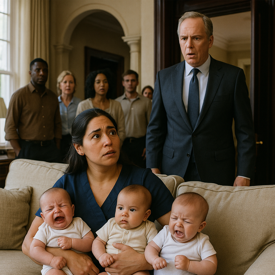 Standing in the middle of the guest lounge was one of his longest-serving employees, Maria, a reserved young woman who had worked quietly in the house for nearly three years. But Maria was not alone. Clutched tightly in her arms were three tiny babies—triplets, no older than a few months.