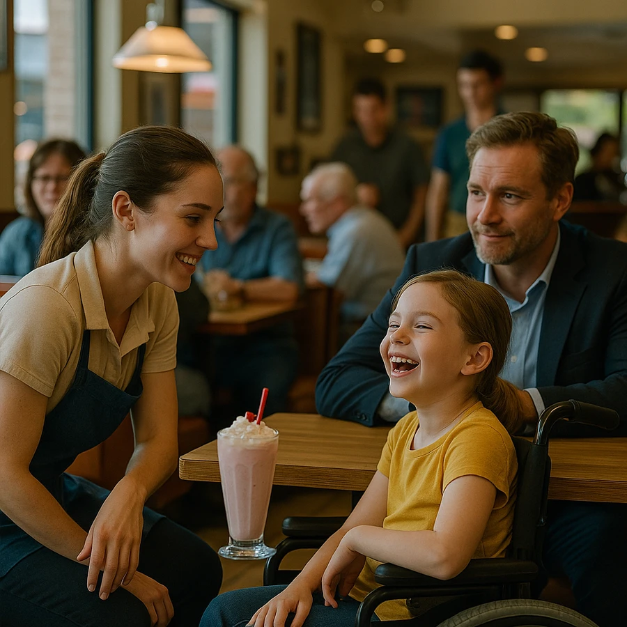 Emily knelt beside Hannah’s booth. “You know,” she said with a grin, “we have milkshakes here that are so good they should come with a warning label. Want me to bring you one?”