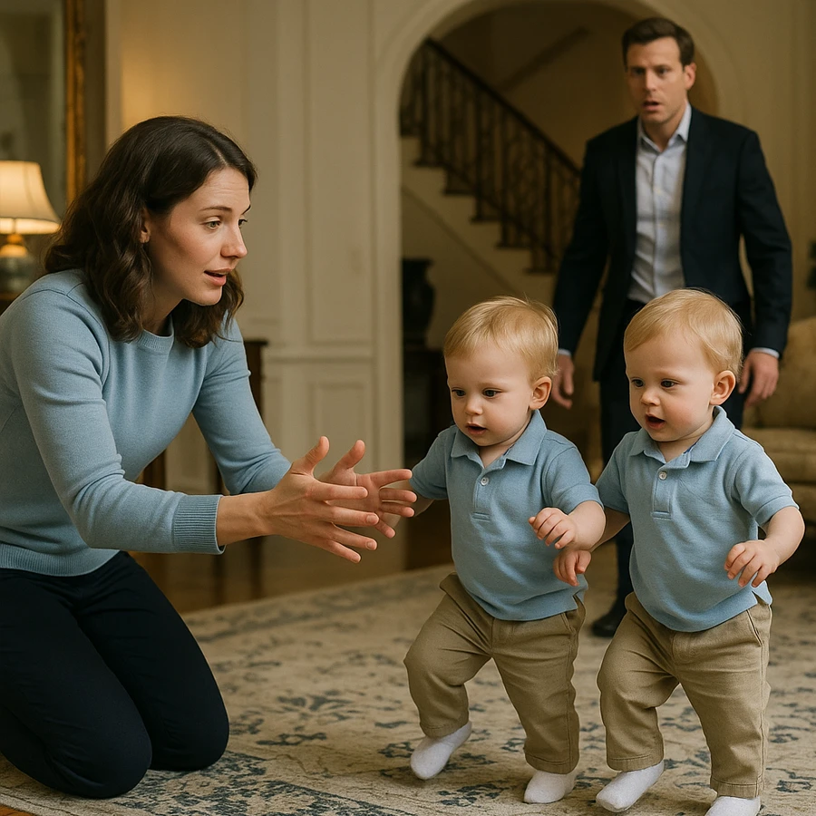There were his twins, holding Clara’s hands, wobbling on unsteady legs… trying to walk. Their tiny faces were scrunched in determination, and Clara, kneeling low, whispered encouragement with every step.