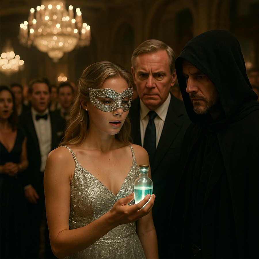 An uninvited guest, cloaked in black, slipped through the marble hallways unnoticed by most. In his hand, he carried a small vial filled with a liquid so strange it seemed to shimmer with a glow of its own. Rumors later claimed it was not from this world—that the liquid had origins connected to secret laboratories or even something supernatural.