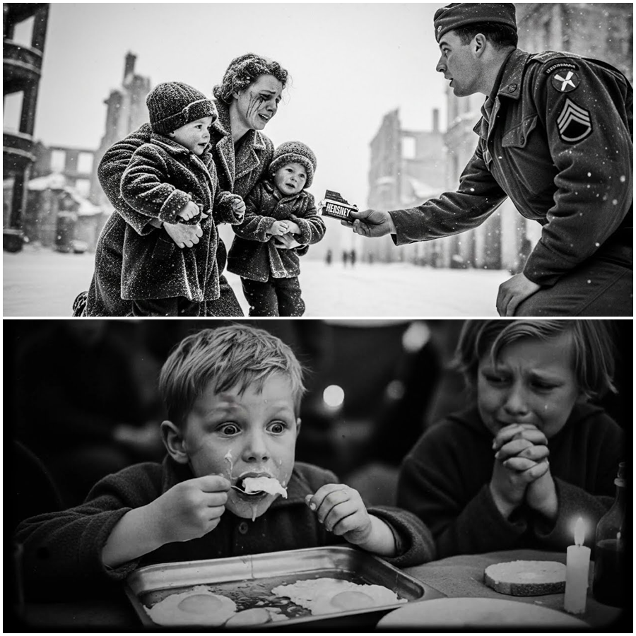 She Fell to Her Knees for One Crust of Bread—But the U.S. Soldier Opened His Rations, Led Her Behind a Ruined Church, and Uncovered a Hidden Ledger That Proved Who Was Hoarding Food, Triggering a Midnight Swap That Saved Her Child
