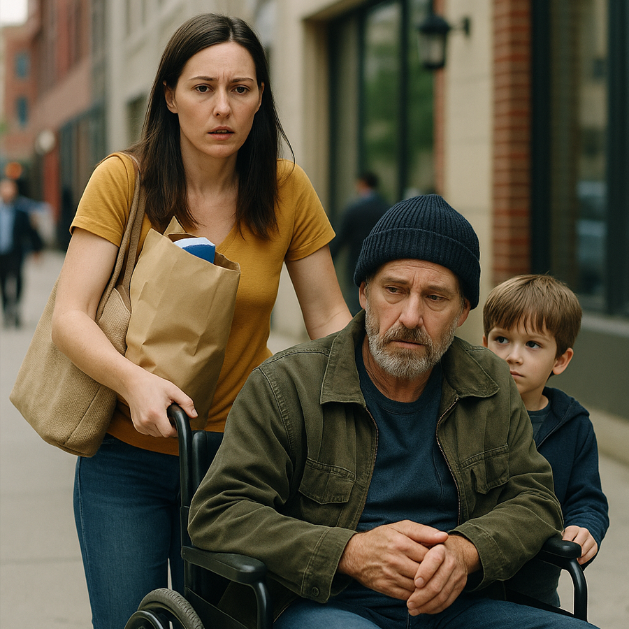 That day, at the corner near the bus stop, she saw him: a man in a battered wheelchair, his clothes worn, his face tired. His hands trembled as he tried to maneuver, but the wheels stuck on the uneven pavement. People walked by quickly, avoiding eye contact. Some muttered complaints about him blocking the way.