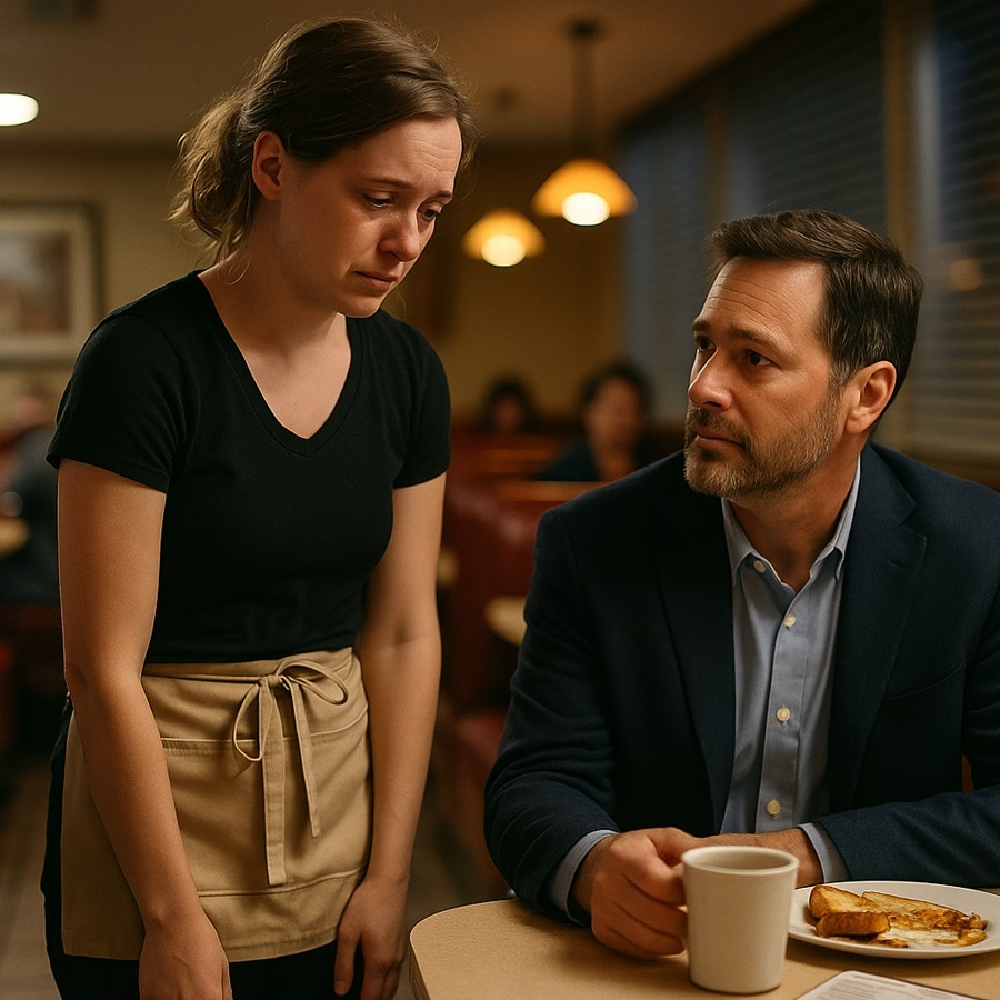 At midnight, when Anna’s spirit was nearly broken, the bell above the door jingled. A man in his forties walked in. He wasn’t flashy, just an ordinary traveler with kind eyes. He ordered a simple coffee and pie.