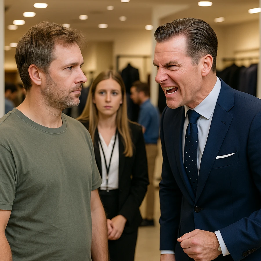 The man remained calm, browsing quietly through racks of suits. But Daniel decided to step in. He approached with a forced smile and a tone dripping with mockery.