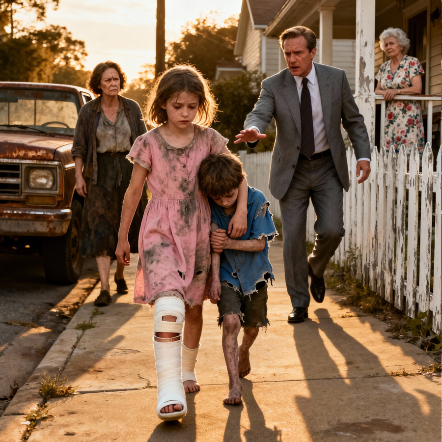 “The Winter Sidewalk Mystery That Stunned an Entire Neighborhood: Why a Little Girl With a Broken Leg Struggled to Drag Her Weak Baby Brother Away From Her Stepmother—Until a Passing Millionaire Witnessed the Chaos and Uncovered a Truth No One Expected That Day”