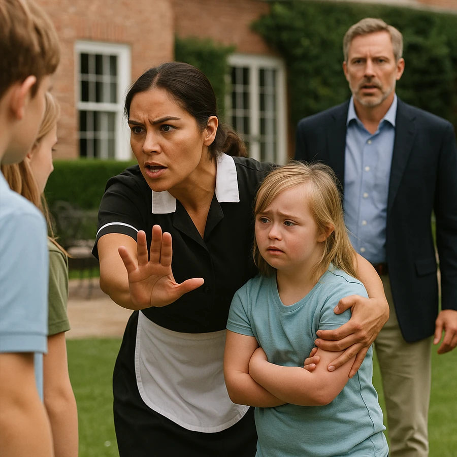 In the heart of an extravagant mansion, where marble floors gleamed under crystal chandeliers and silence reigned like a king, a scene unfolded that no amount of wealth could have predicted. A wealthy father, obsessed with business, control, and appearances, stumbled upon a truth that shattered his carefully constructed world: his maid protecting his special daughter from cruelty he had chosen to ignore.