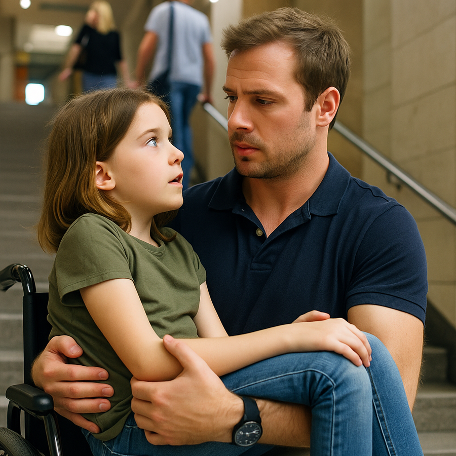 The grand staircase stood silent, polished by years of footsteps, but on that particular day, something extraordinary happened. A girl in a wheelchair, small but fierce in spirit, looked up at the man beside her and whispered words that froze him in place: “If you carry me upstairs, I’ll tell you a secret.”