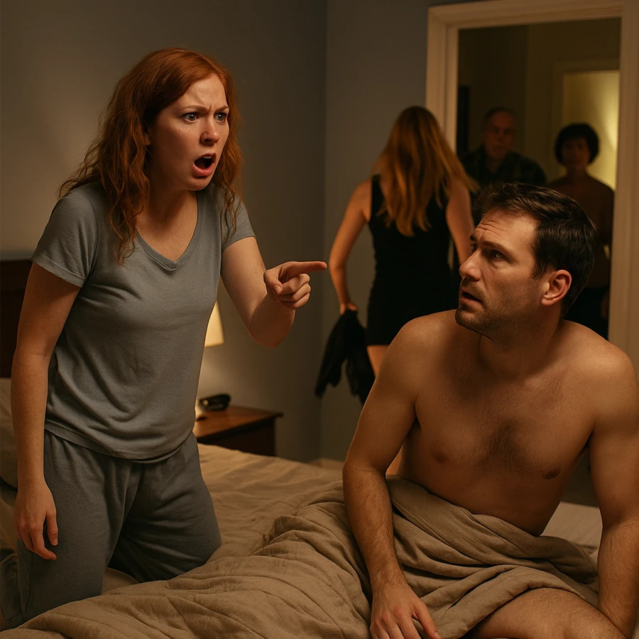 She stumbled down the hallway, only to hear whispers and muffled laughter. Pushing open the bedroom door, she froze.