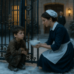 A kind maid saw a small, starving boy shivering outside the mansion gates. Believing her wealthy boss was gone for the day, she risked everything to sneak him into the kitchen and give him a hot meal.