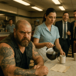 The camera opens on a gray, rainy afternoon. A gang of rugged bikers roars down a lonely road, their engines echoing through an empty town. People move aside nervously. No one dares to cross their path