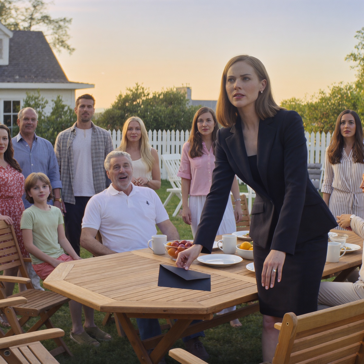 The backyard stilled. The only sound was the faint crackle of the grill and the TV announcer’s distant shout about another home run. No one laughed this time. No one spoke. All eyes locked on that envelope, on my father’s hands hovering uncertainly above it.