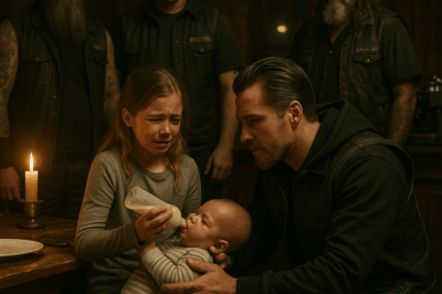 The shop lights hummed in the midnight quiet when a tiny fist tapped the steel door. “Owen Slate Mercer, Hell’s Angel’s captain, opened it to a barefoot girl clutching a blue bottle. Do you have milk?” she whispered, voice shaking.’